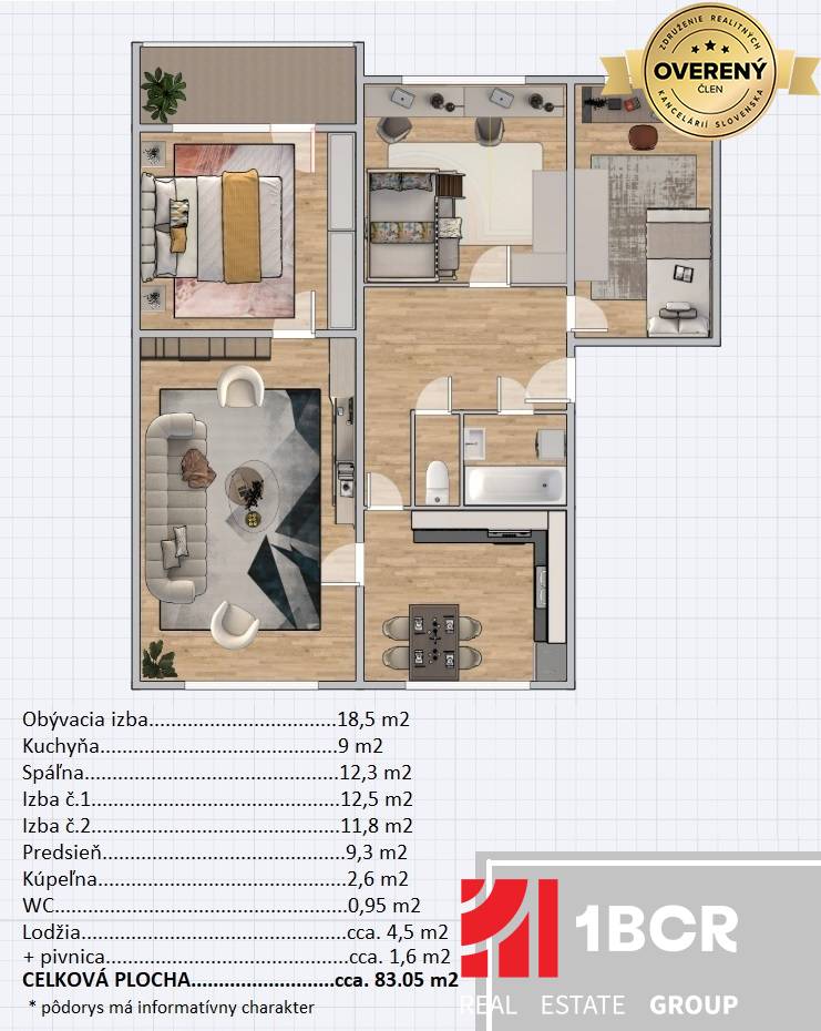 © Text a pôdorys je autorským dielom a majetkom 1.BCR GROUP. Všetky prezentované údaje zverejnené v tomto inzeráte majú informatívny charakter a žiadnej strane nevzniká nárok na uzatvorenie zmluvy. Pôdorys je informačný. Spoločnosť 1.BCR s.r.o. nenesie za ich správnosť, úplnosť a presnosť žiadnu zodpovednosť.