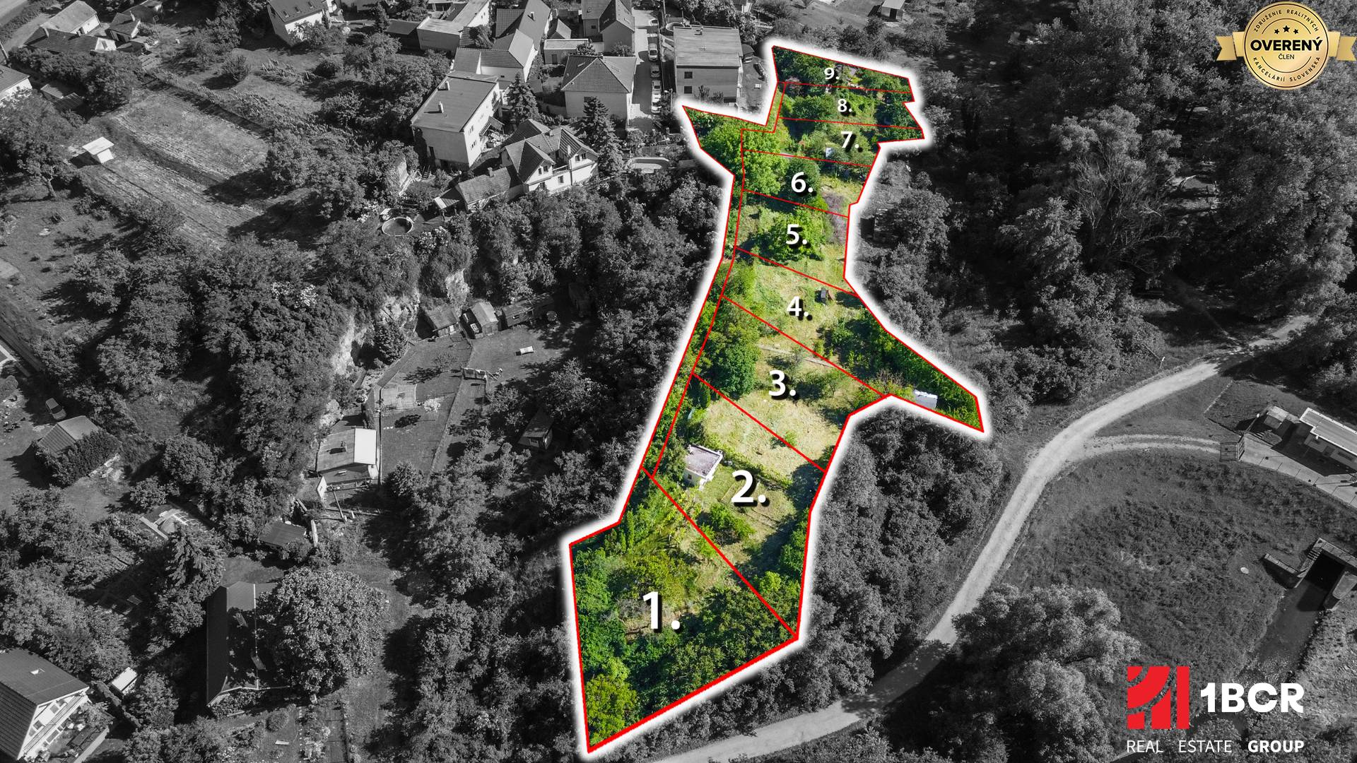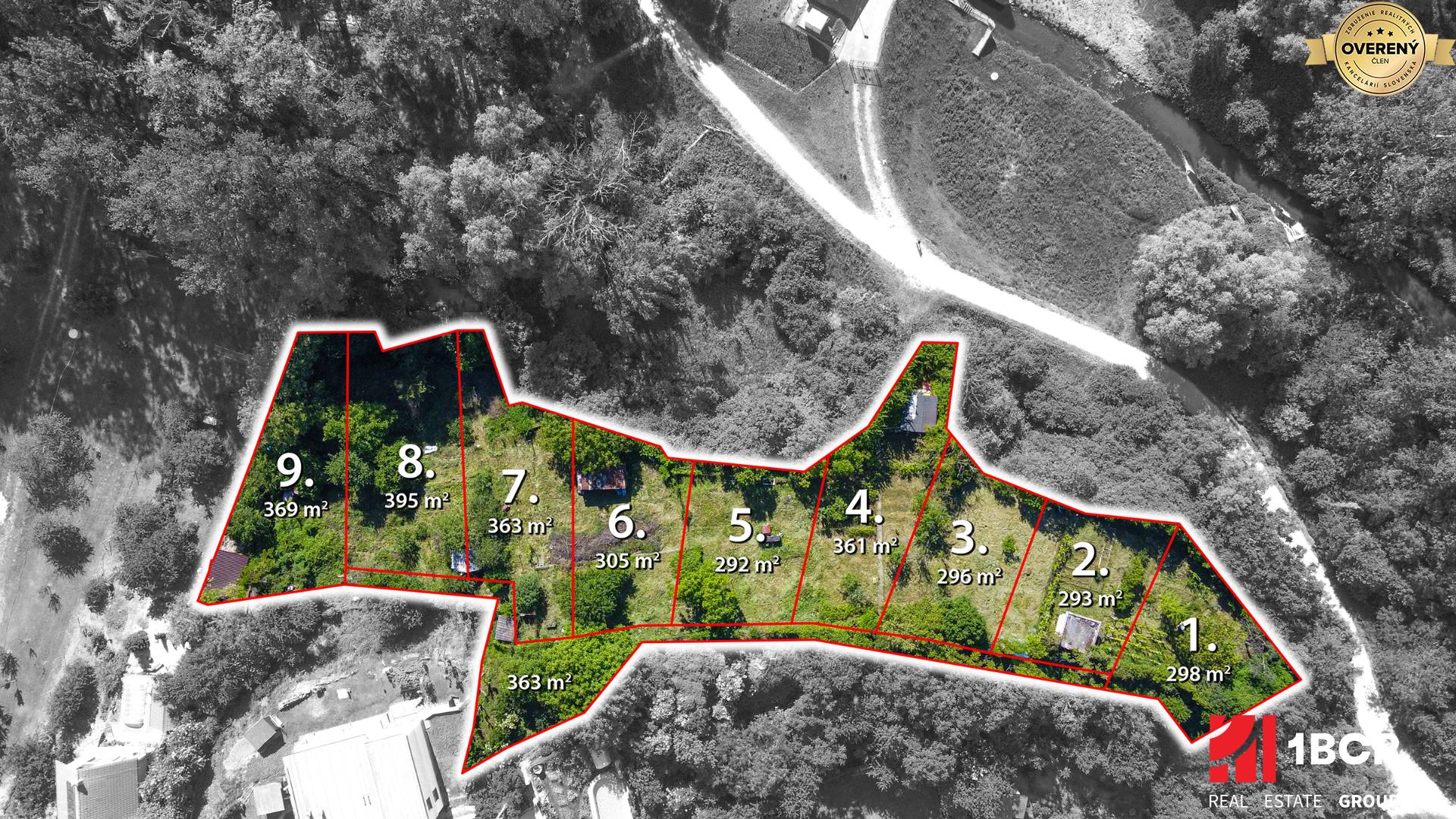 Každý pozemok má podiel 1/9 na spoločnej prístupovej ceste s výmerou 363 m².
