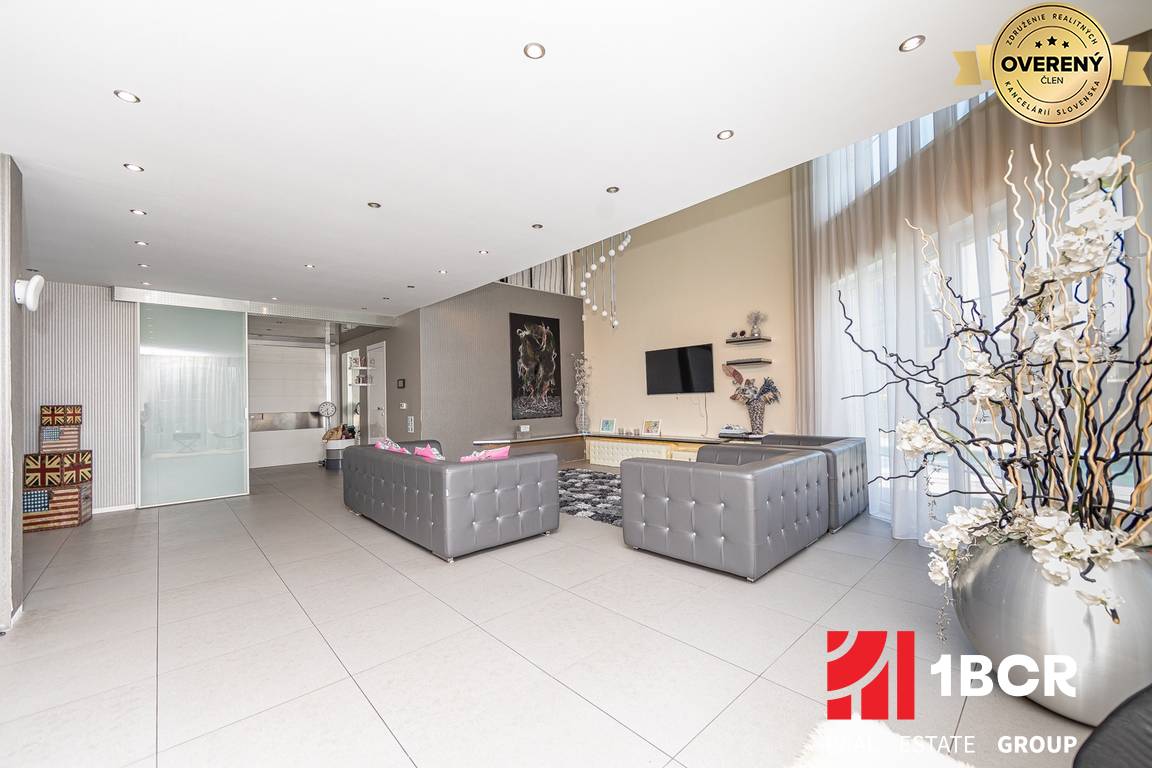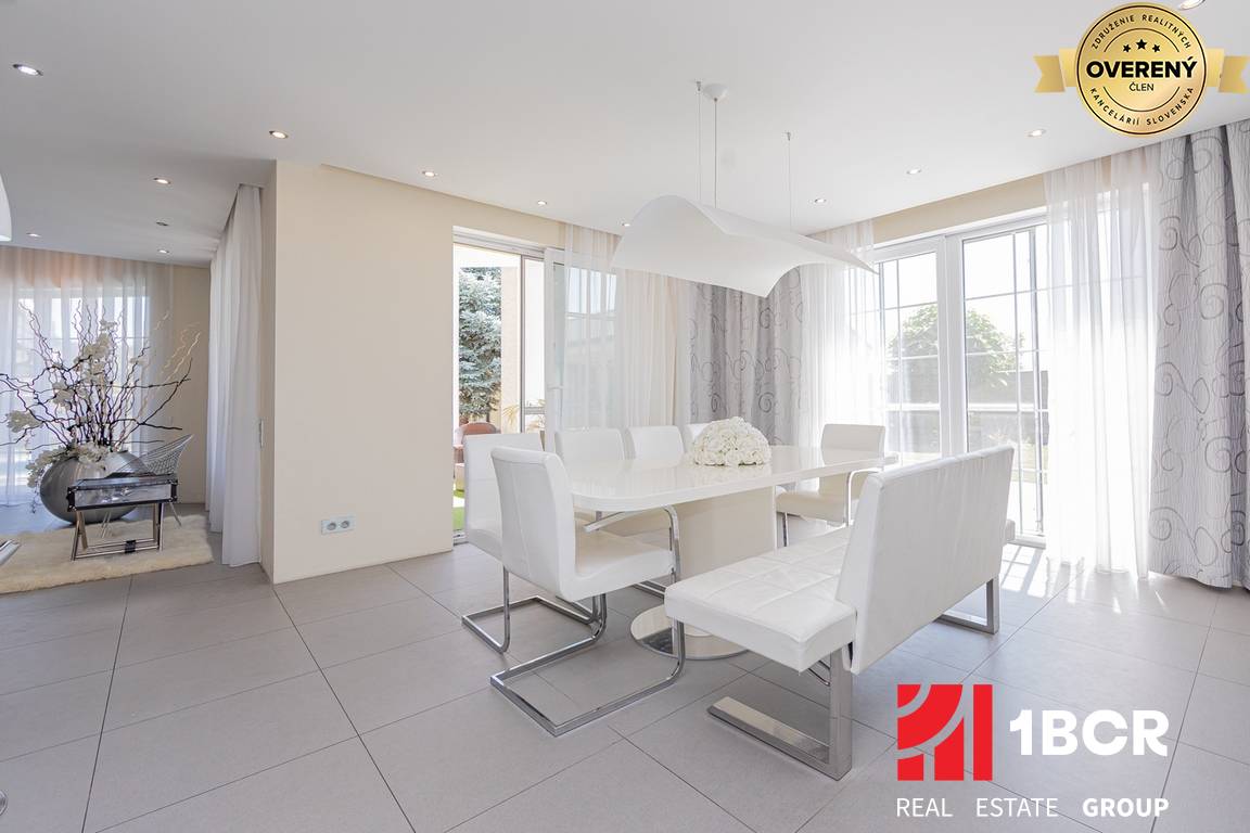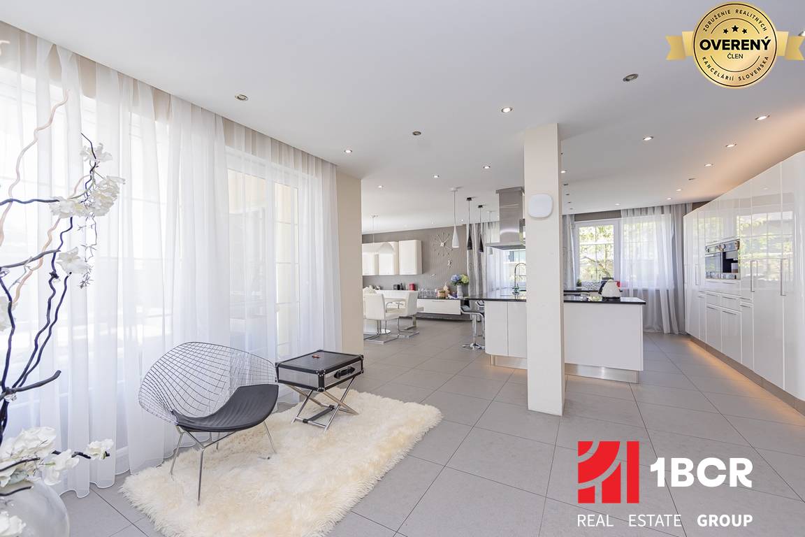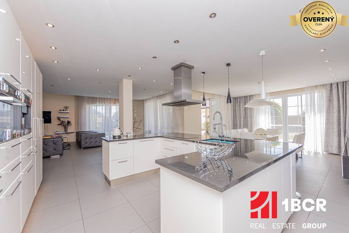 Vila je priestranná, presvetlená a prepojená s exteriérom cez veľkoformátové okná a terasy. Denná zóna tvorí otvorený koncept obývacej izby, jedálne a kuchyne so vstupom na terasu a do záhrady. Dominantou priestoru je moderná kuchyňa so zabudovanými spotrebičmi, ostrovčekom a priestrannou jedálňou. Obývacia časť ponúka vysoký strop, galériu a výstup na krytú terasu s výhľadom na bazén.