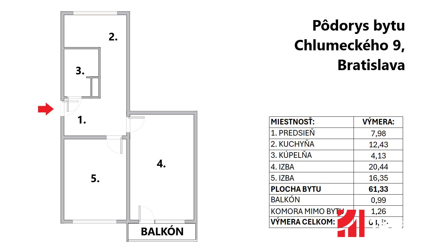 - Výmera bytu: 61.33 m2