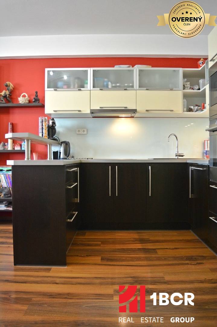 - kuchynská linka na mieru so zabudovanými spotrebičmi (umývačka riadu, elektrická rúra, elektrická varná doska, mikrovlnná rúra, chladnička s mrazničkou) a barovým pultom