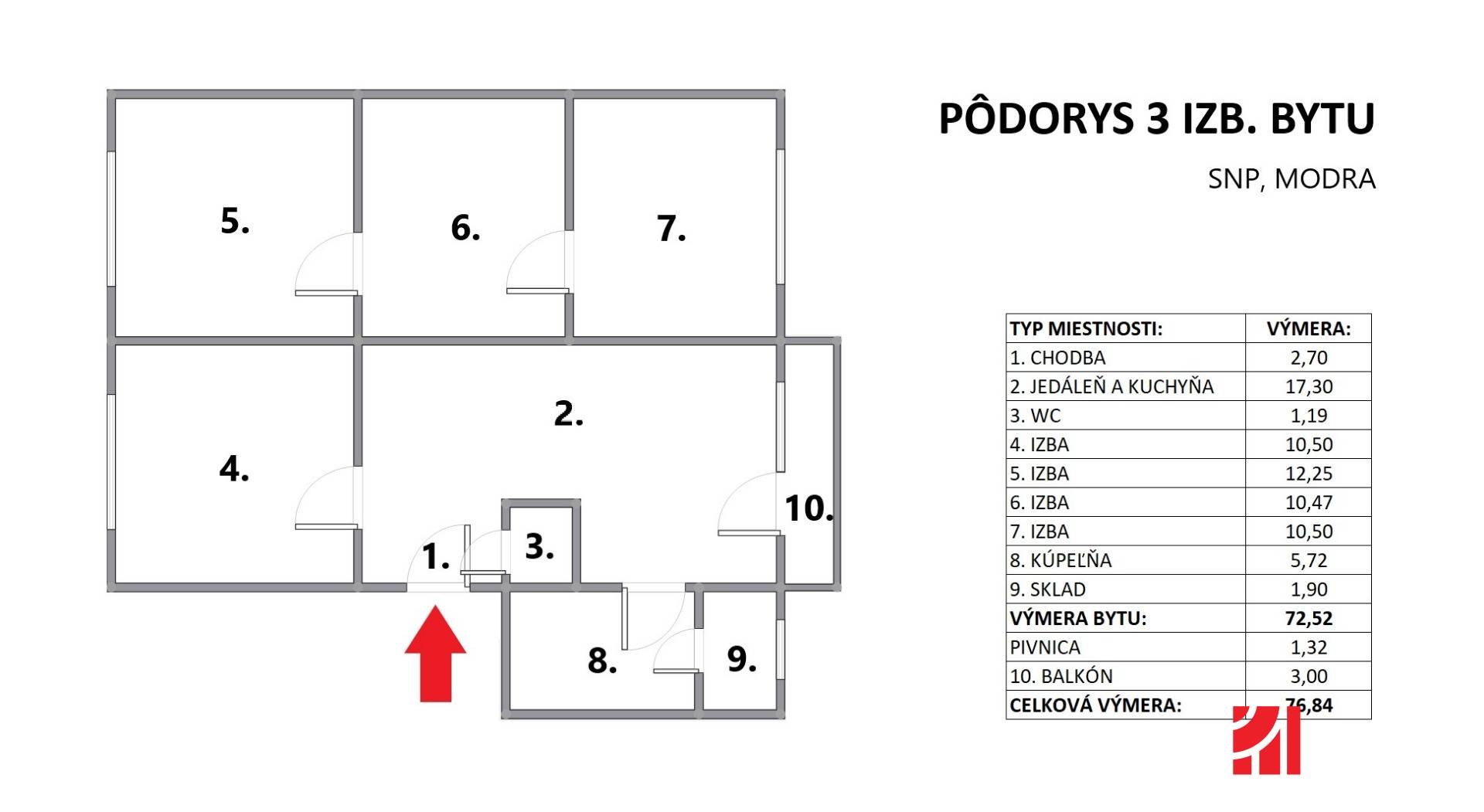 * Výmera bytu: 72,52 m2