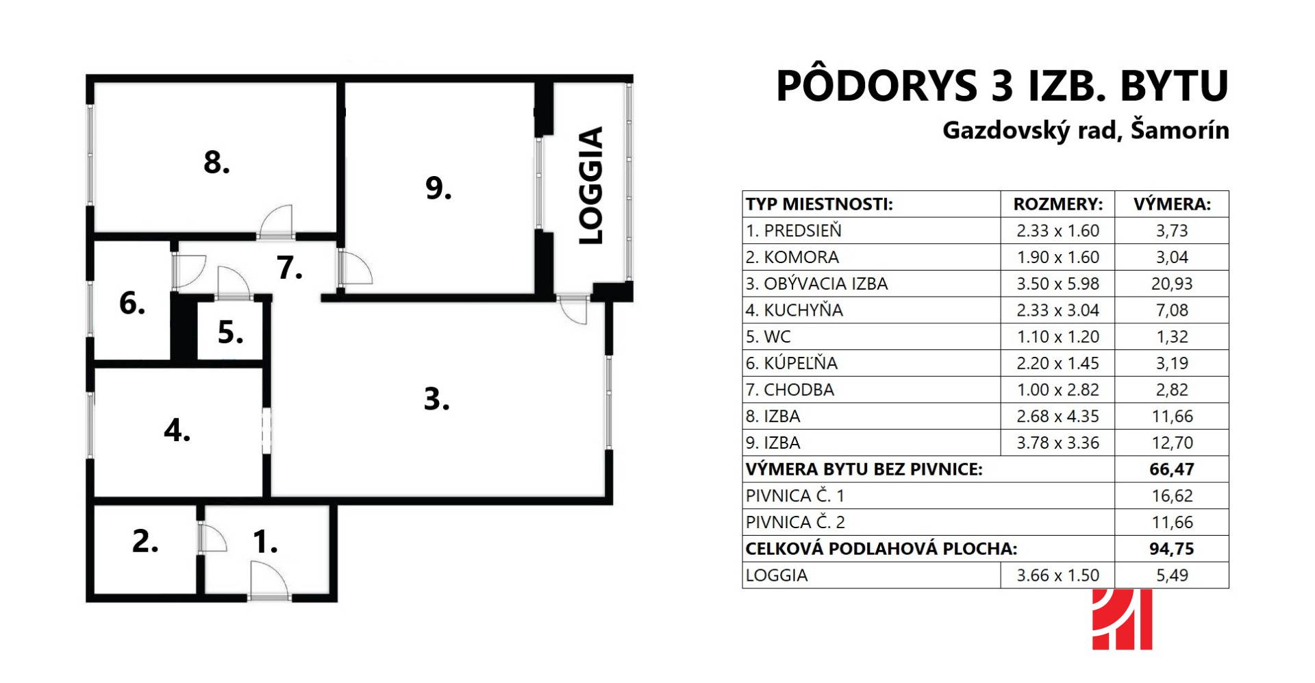 Predsieň, komora, priechodná obývačka, kuchyňa, z obývačky je aj východ na loggiu, chodba, samostatné WC, kúpeľňa a 2 izby. K bytu patria aj dve pivnice, ktoré sú umiestnené v suteréne bytového domu.