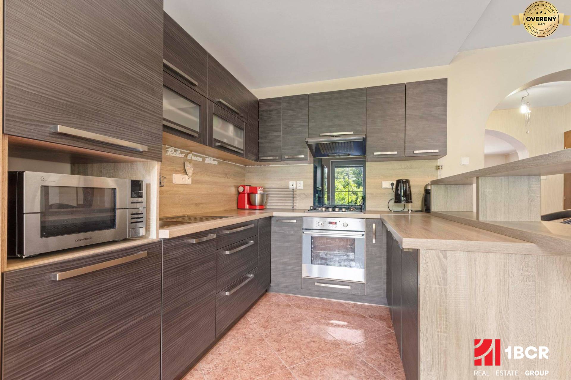 * Kuchynská linka vyrobená na mieru s barovým pultom a so vstavanými spotrebičmi: el. rúra, plynová varná doska, digestor, voľne stojaca chladnička s mrazničkou.
