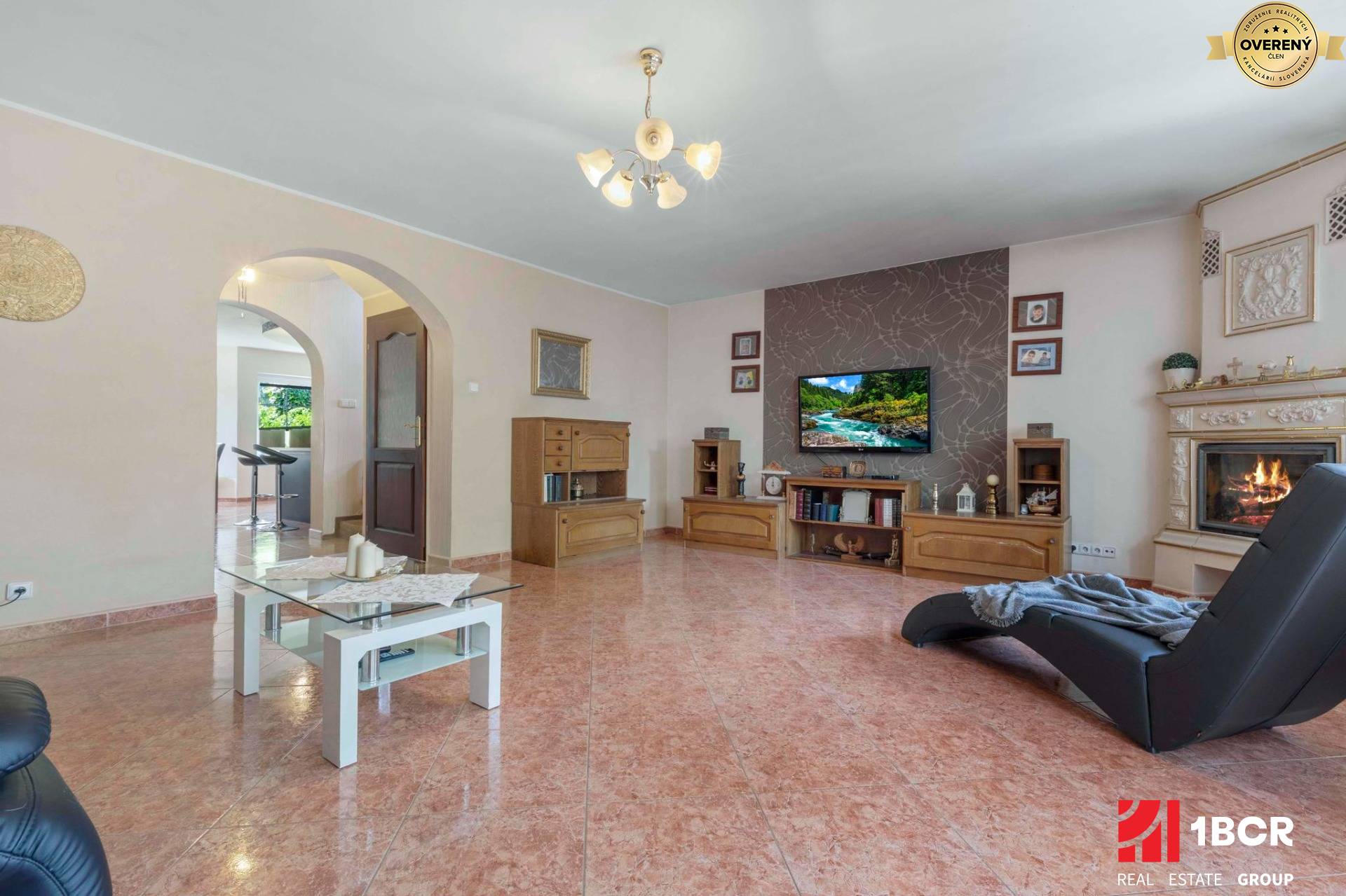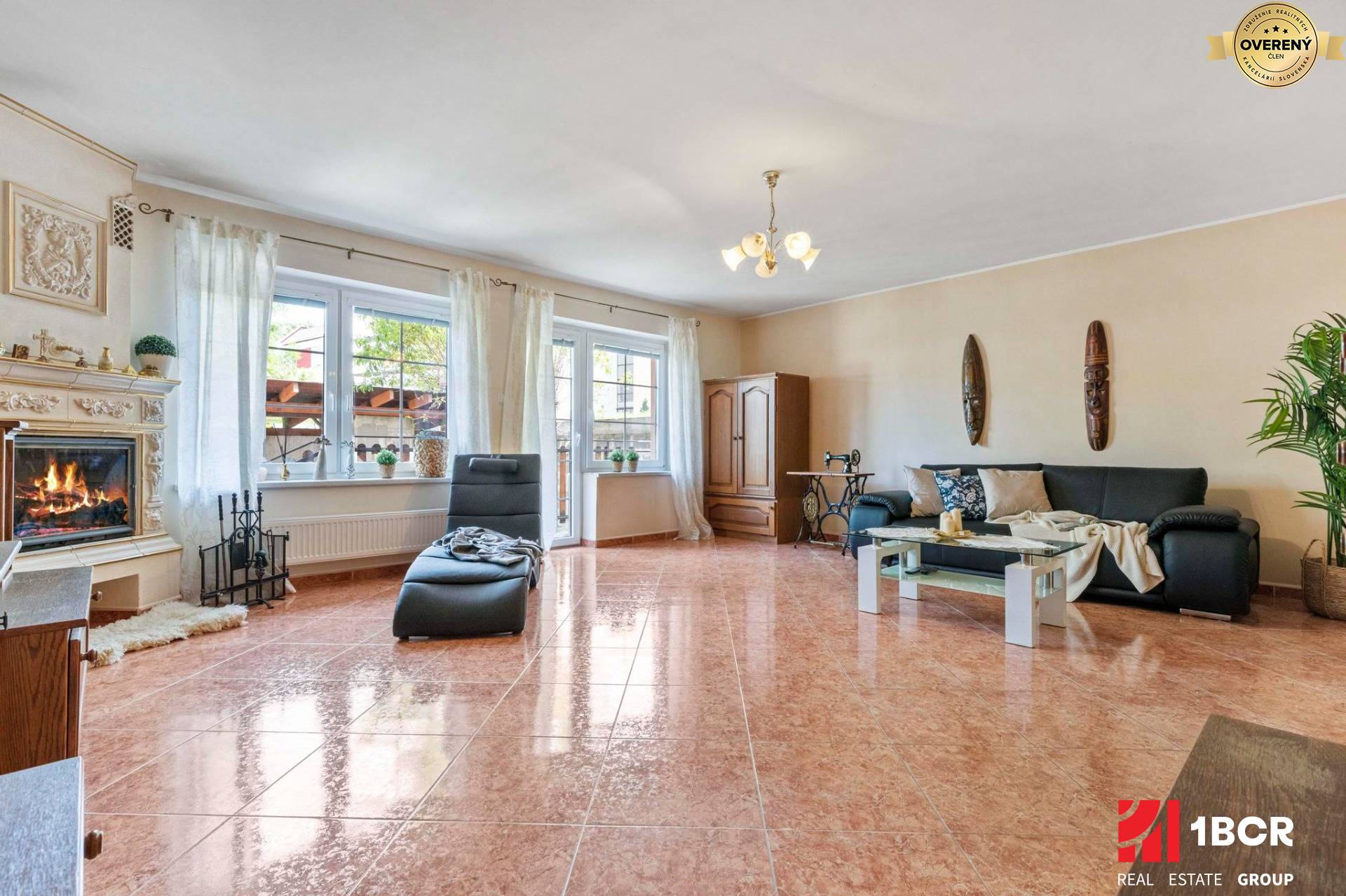 * Priestranná obývacia izba s krbom a so vstupom na loggiu, kadiaľ sa dostane na dvor