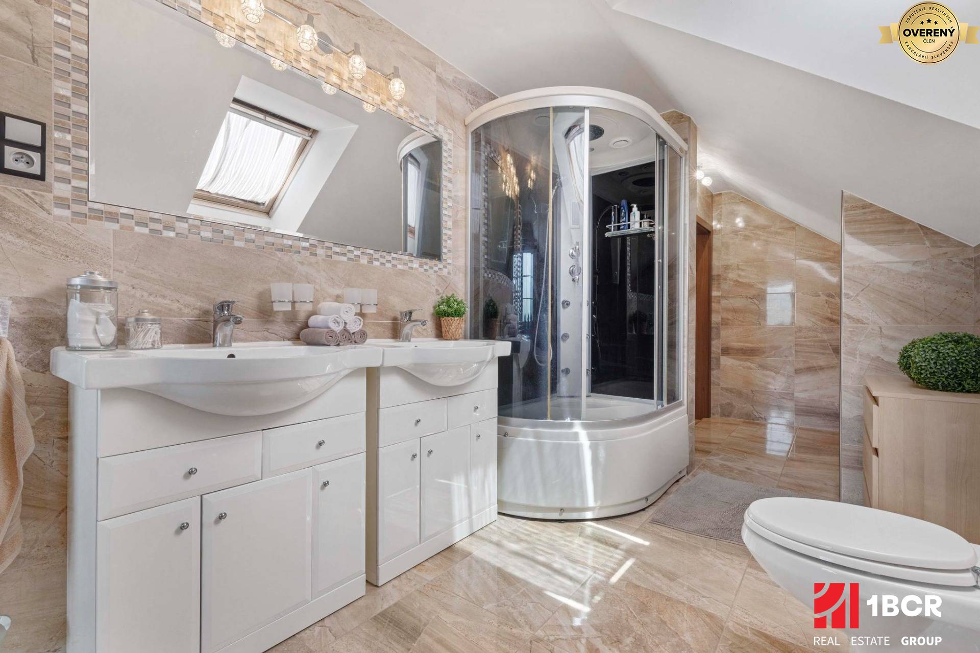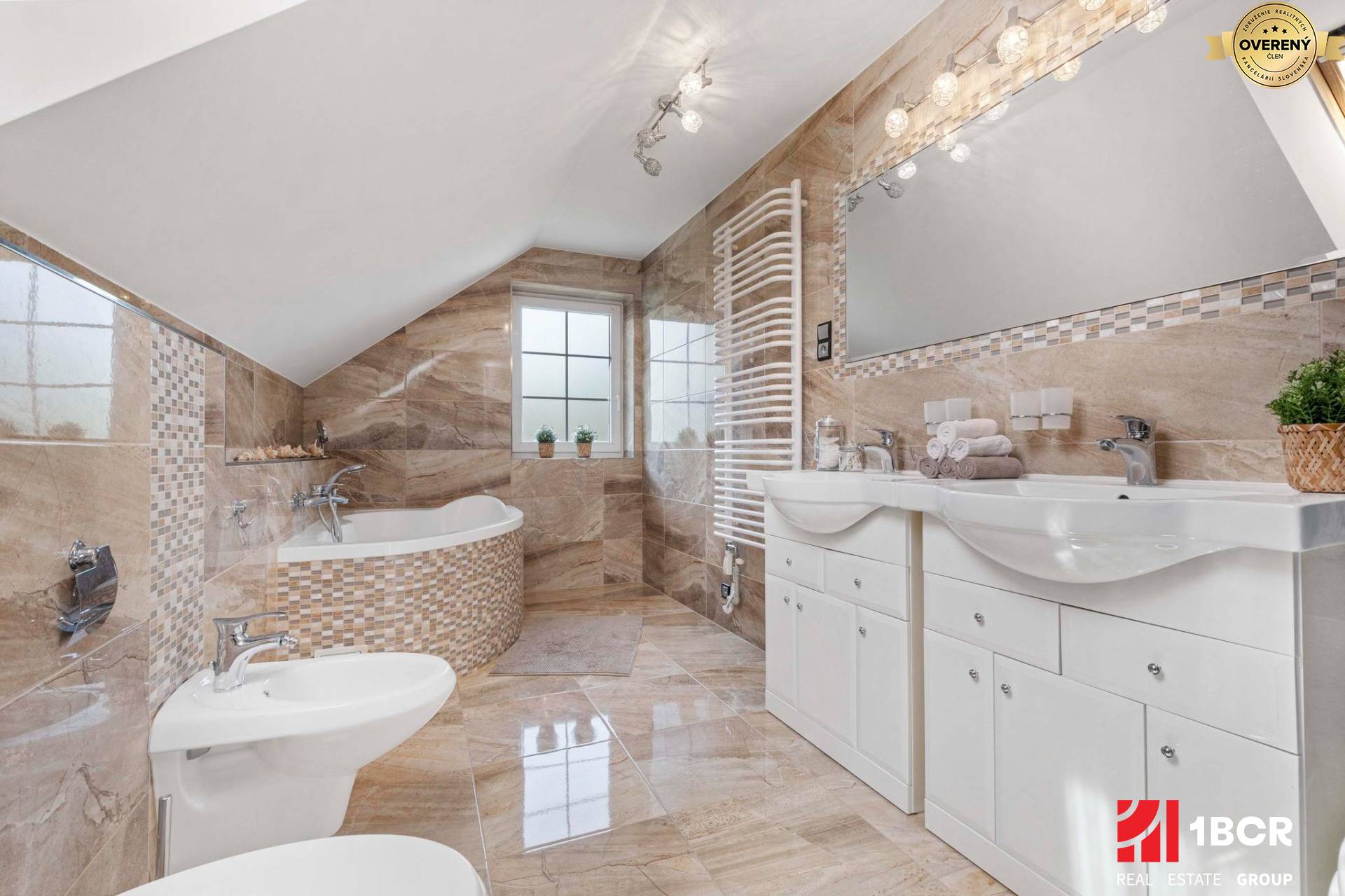* Priestranná kúpeľňa s WC, bidet, 2x umývadlo so skrinkami, rohová vaňa, sprchovací box