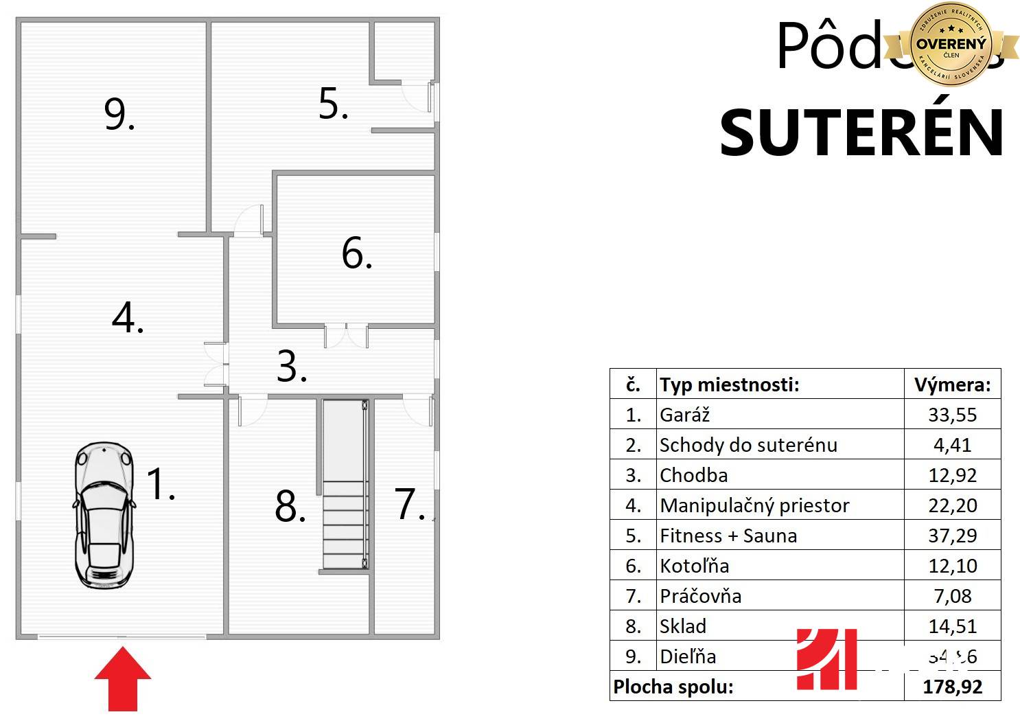 * Suterén: garáž, manipulačný priestor, fitness + sauna, dielňa, sklad, kotolňa, sklad, chodba so schodiskom so vstupom na prízemie RD