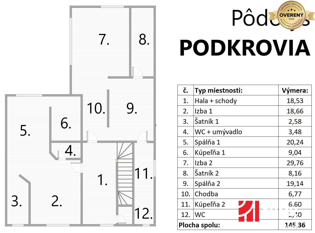 * Podkrovie: hala so schodiskom, izba so šatníkom, WC, kúpeľňa, spálňa so šatníkom, s kúpeľňou a WC