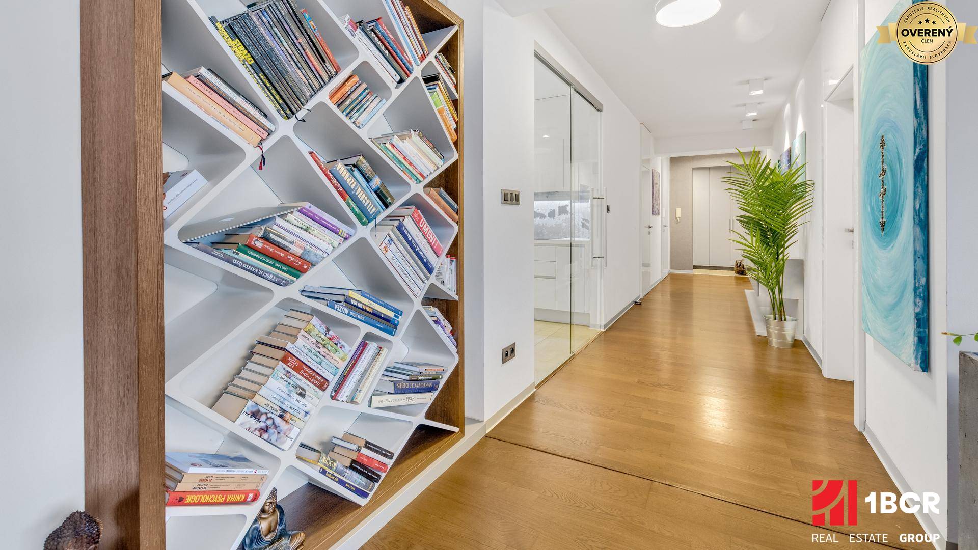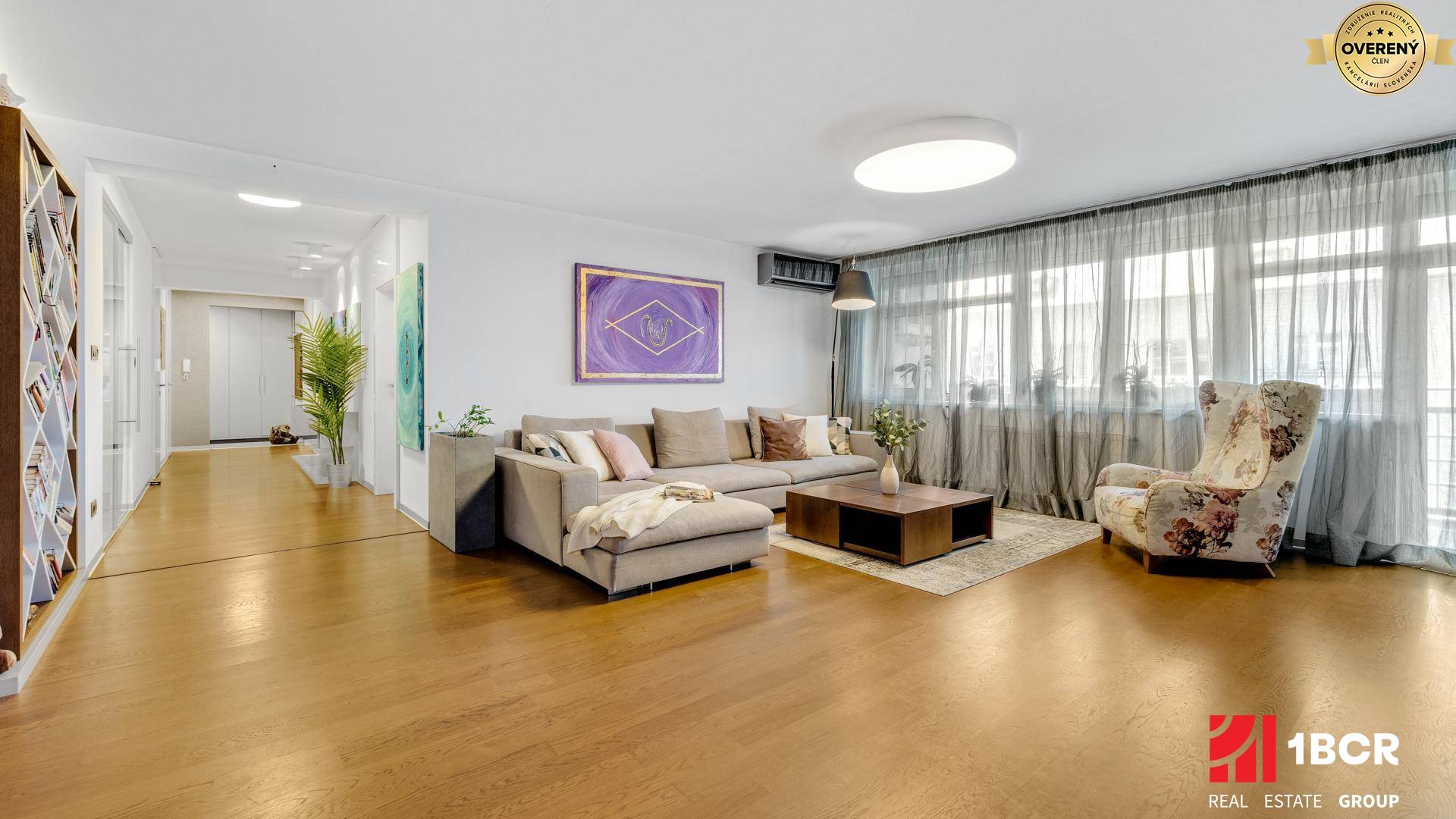 Samotný byt je situovaný na 2. poschodí tehlového bytového domu s výťahom, ktorý bol kolaudovaný v roku 2003. V roku 2012 prešiel kompletnou rekonštrukciou, navrhnutou a zrealizovanou renomovaným architektonickým štúdiom, vďaka ktorej spĺňa kritéria aj náročného klienta. Dispozične pozostáva z rozľahlej predsiene s úložným priestorom, ktorá pokračuje do širokej chodby. Tá spája všetky miestnosti vrátane dvoch priestranných spální a veľkorysej obývacej izby spojenej s jedálenským kútom. Kuchyňa je oddelená presklenými posuvnými dverami, čo necháva presvetlený priestor, no zároveň práca v kuchyni neruší obyvateľov bytu. Je vybavená kuchynskou linkou so vstavanými spotrebičmi (indukčná varná doska, kombinovaná rúra s mikrovlnkou, umývačka riadu, kávovar, samostatná chladnička, samostatná mraznička), digestor, reverzná osmóza Crystal PREMIUM. Z kuchyne je vstup do komory, ktorá môže slúžiť nie len na uskladnenie potravín, ale aj ako práčovňa. Príslušenstvom bytu je kúpeľňa s priestranným sprchovacím kútom a toaletou, hosťovská toaleta s umývadlom a dve veľké loggie, na ktoré ja prístup z každej izby (6,32 m2 a 11,40 m2). Na menšiu loggiu s výmerou 6,32 m2 je vstup možný z oboch spální, na väčšiu loggiu s výmerou 11,40 m2 sa dostanete z obývacej izby. V každej obytnej miestnosti je vstavaná skriňa, klimatizácia značky LG a dátové rozvody pre optický internet od UPC. V cene bytu je zahrnutý exkluzívny vstavaný nábytok.