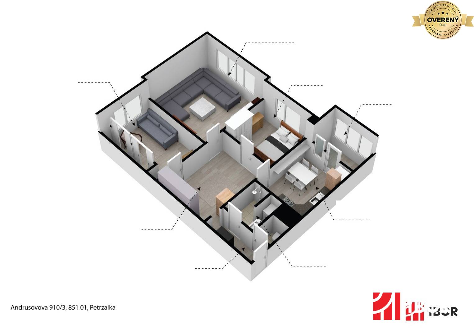 Ponúkame na predaj čiastočne zrekonštruovaný 3 izbový byt, ktorý sa nachádza vo vyhľadávanej lokalite Petržalky na Andrusovovej ulici na 9. poschodí s orientáciou na juho/východ. Bytový dom prešiel čiastočnou rekonštrukciou kompletného zateplenia, výmeny vchodových brán, úprava spoločných priestorov a v blízkej dobe, by sa mala riešiť aj rekonštrukcia stúpačiek a výťahov.