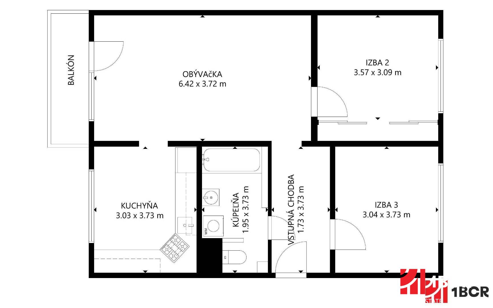 * Celková plocha: 66,82 m2 + balkón