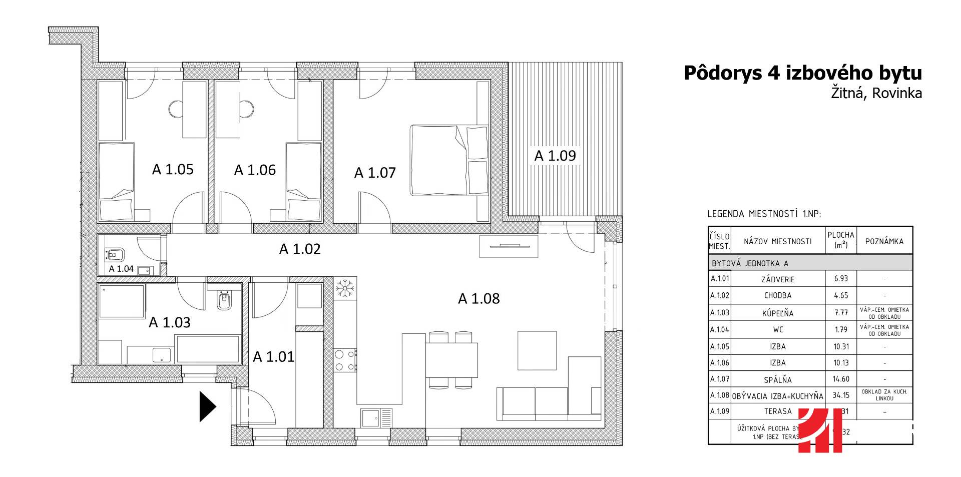 * Typ: 4 izbový byt s terasou, so záhradou a parkovacím státím