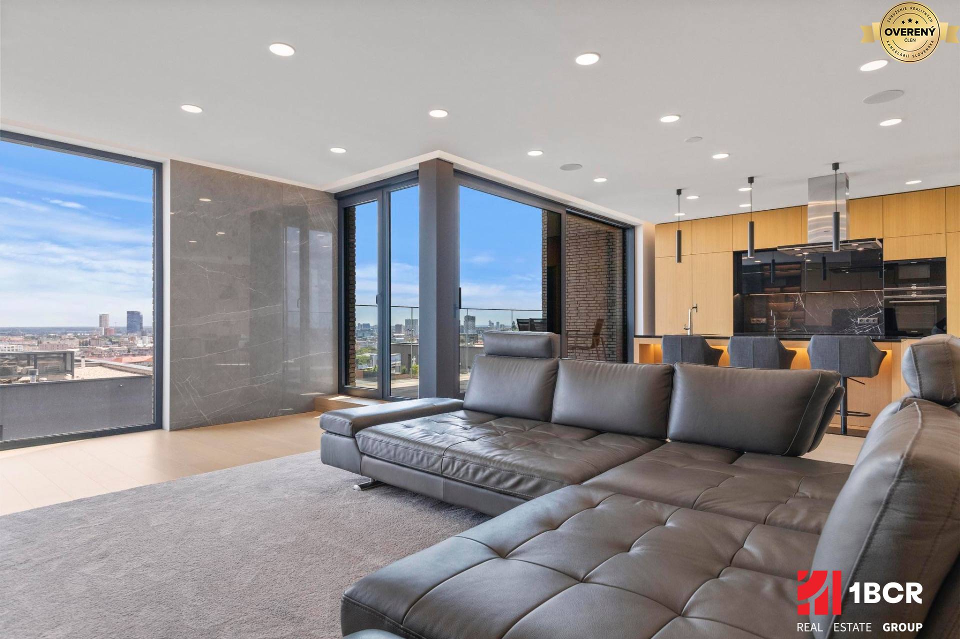V obývacej izbe kvalitná kožená sedacia súprava zn. KUKA a na mieru zabudovaná knižnica s dostatkom úložného priestoru a s celou sklenenou stenou s úžasným výhľadom aj na nočnú vysvietenú Bratislavu, len podtrhuje ten pravý dojem luxusu.