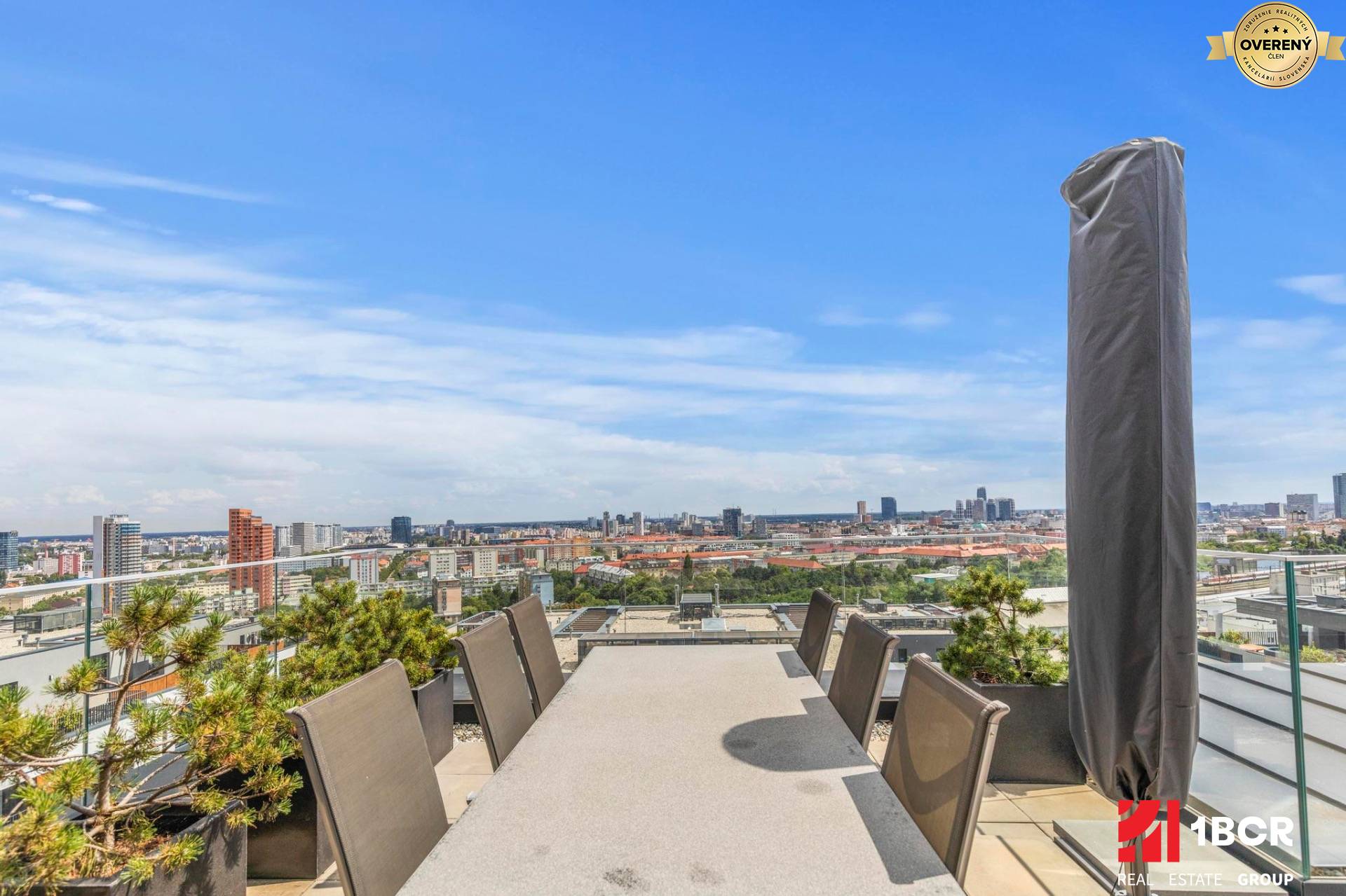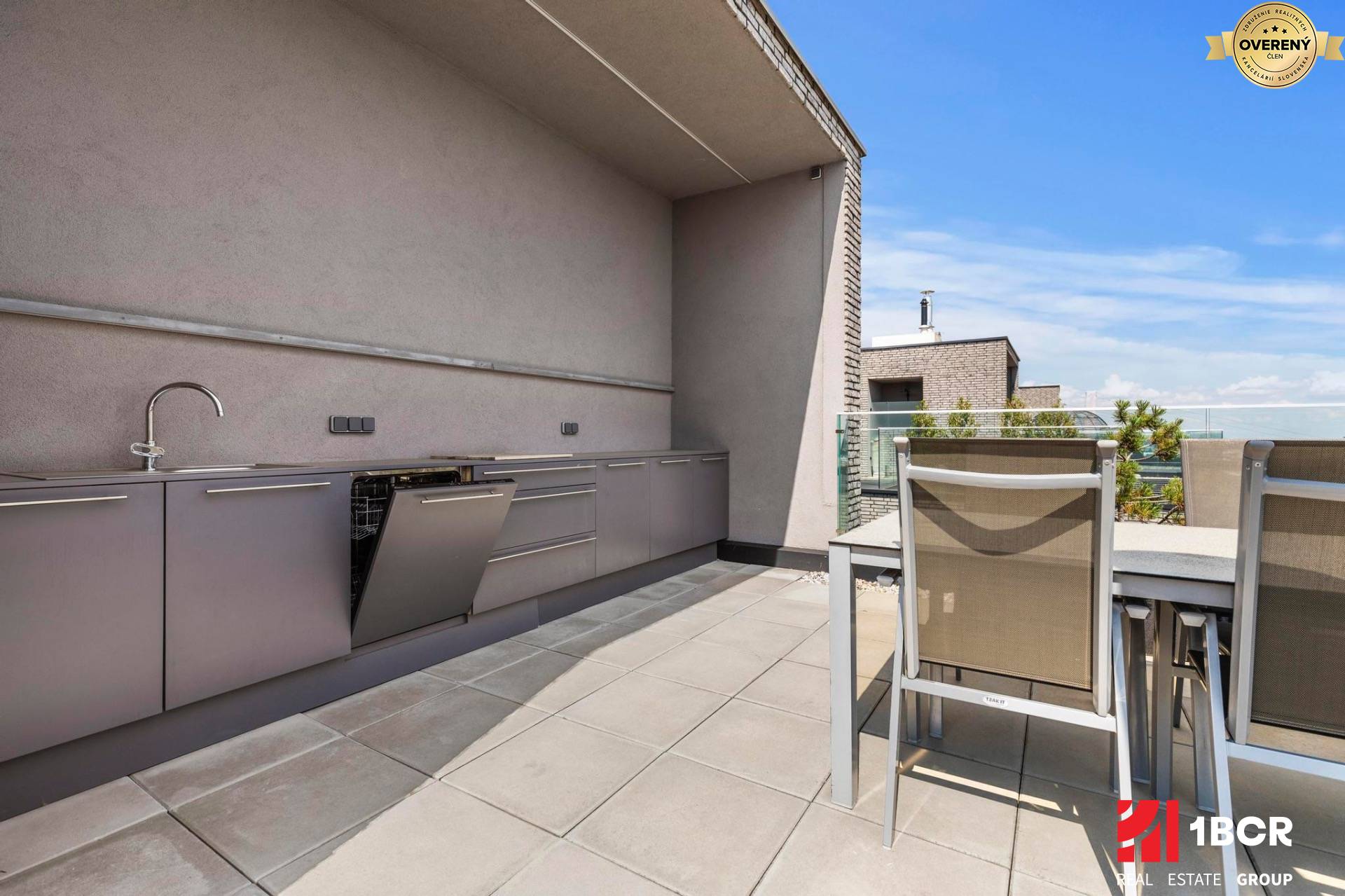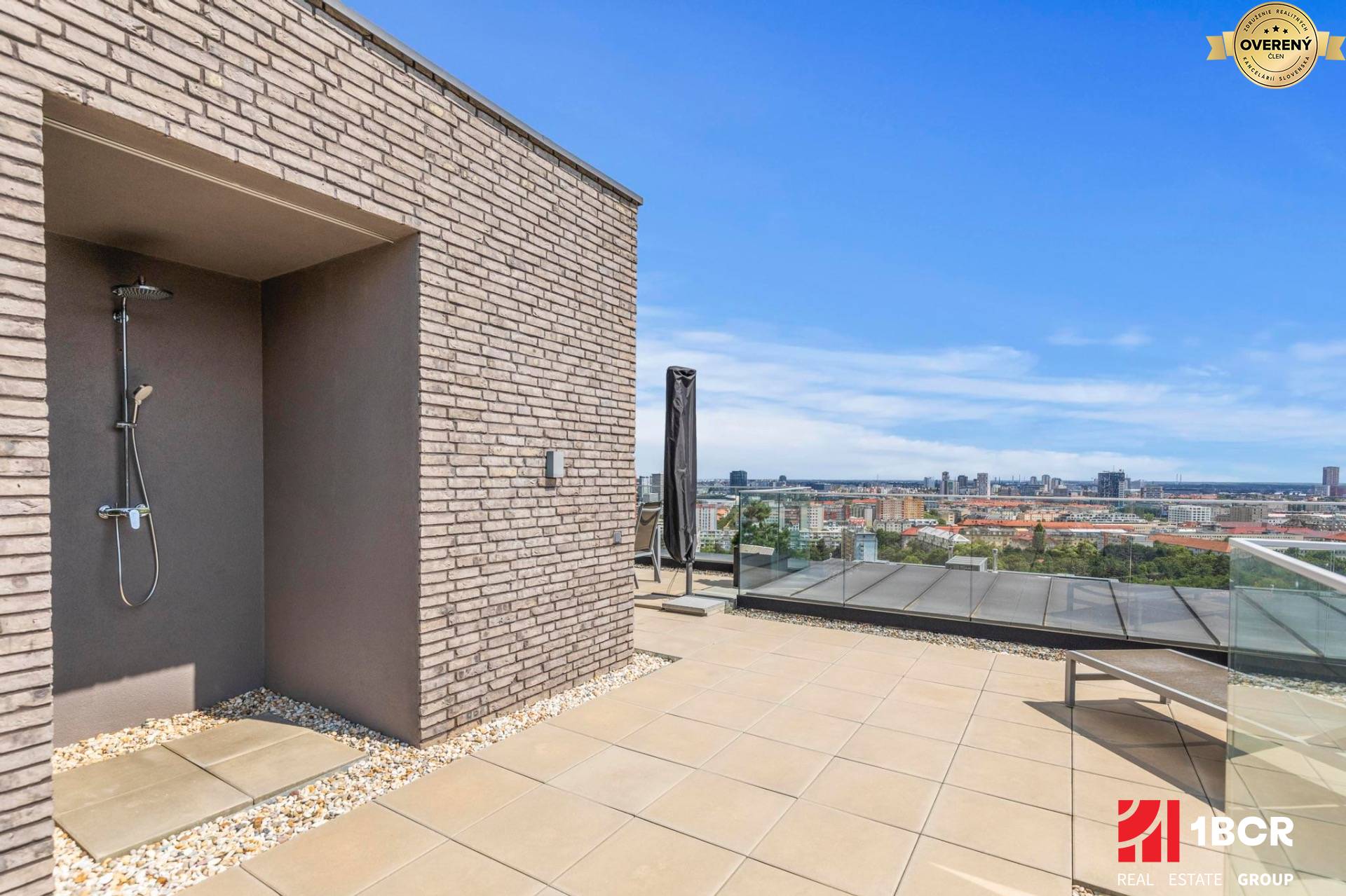 Medzi najväčšie benefity tohto bytu patrí privátna strešná terasa s výmerou 66,24 m². Ponúka panoramatický výhľad na mesto, poskytuje Vám súkromie a okrem iného disponuje letnou kuchyňou so zabudovanými spotrebičmi (chladnička a umývačka riadu) či sprchou za horúcich dní na lehátku s knihou. Je vhodná na celoročné pohodlné rodinné posedenia či grilovačky s priateľmi alebo iba leňošenie na slnku v tichu a s úžasnými výhľadmi. Relax o akom sa Vám ani nesnívalo. Na terasu ide samozrejme taktiež súkromný výťah.