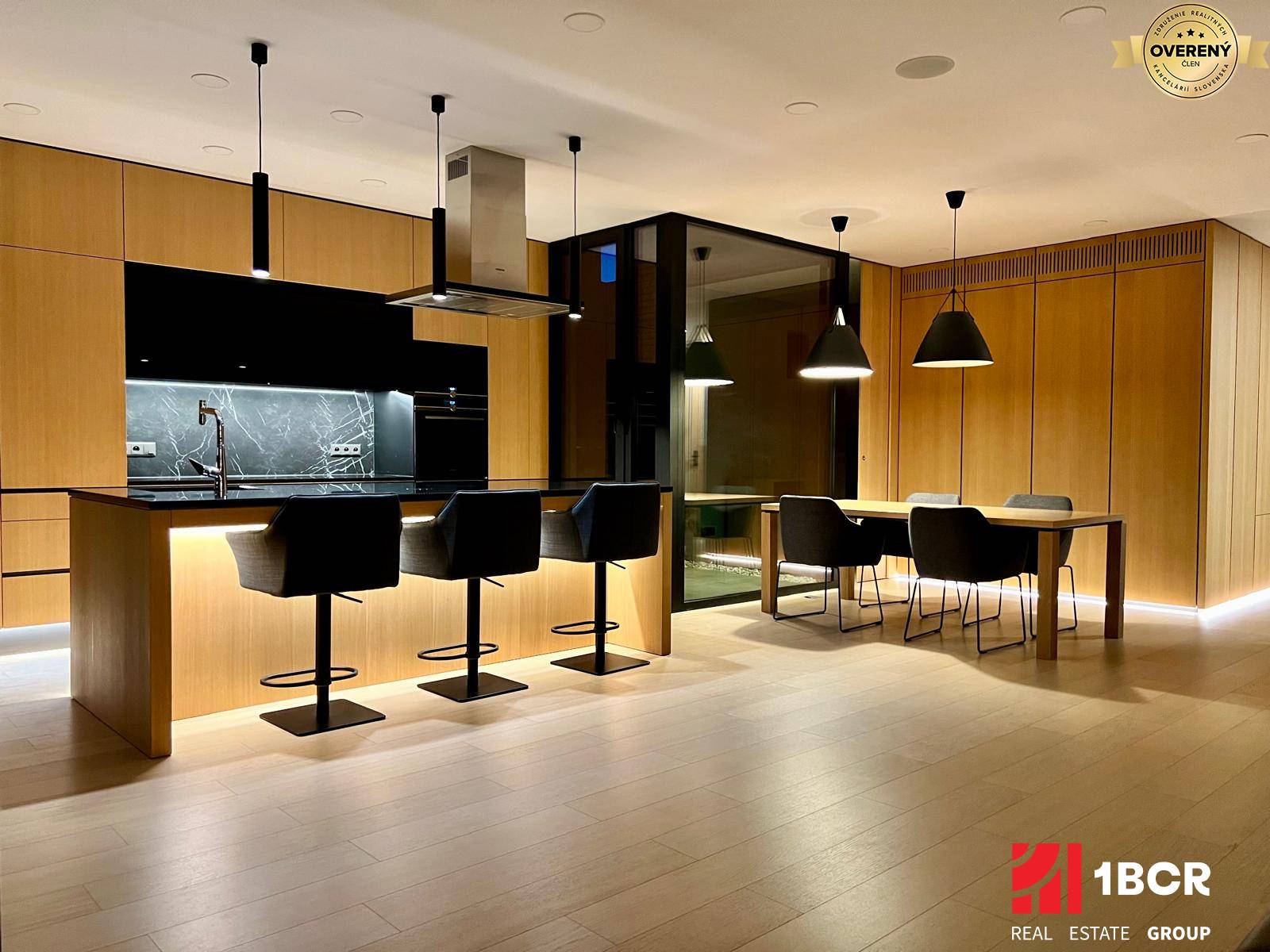 Denná časť - veľkorysý otvorený priestor s kuchyňou, obývacou izbou a to všetko s úžasným panoramatickým výhľadom na Bratislavu. Vstup z kuchynskej časti na raňajkovú terasu je príjemným spestrením luxusného zážitku z výhľadu. Architektonický prvok v podobe presklenného átria tvorí srdce domu, kde hlavne cez Vianoce, pri rozžiarenom vianočnom stromčeku, si vychutnáte romantickú rodinnú atmosféru nielen z Vianoc, ale hlavne z dostatku denného mäkkého svetla. Praktickú práčovňu so sušičkou ocenia všetci, tak ako praktickú a veľmi efektnú kuchynskú linku s kamennou pracovnou doskou na ostrovčeku kde sa dá pri stretnutiach pohodlne sedieť a nazerať pod ruky kuchára.