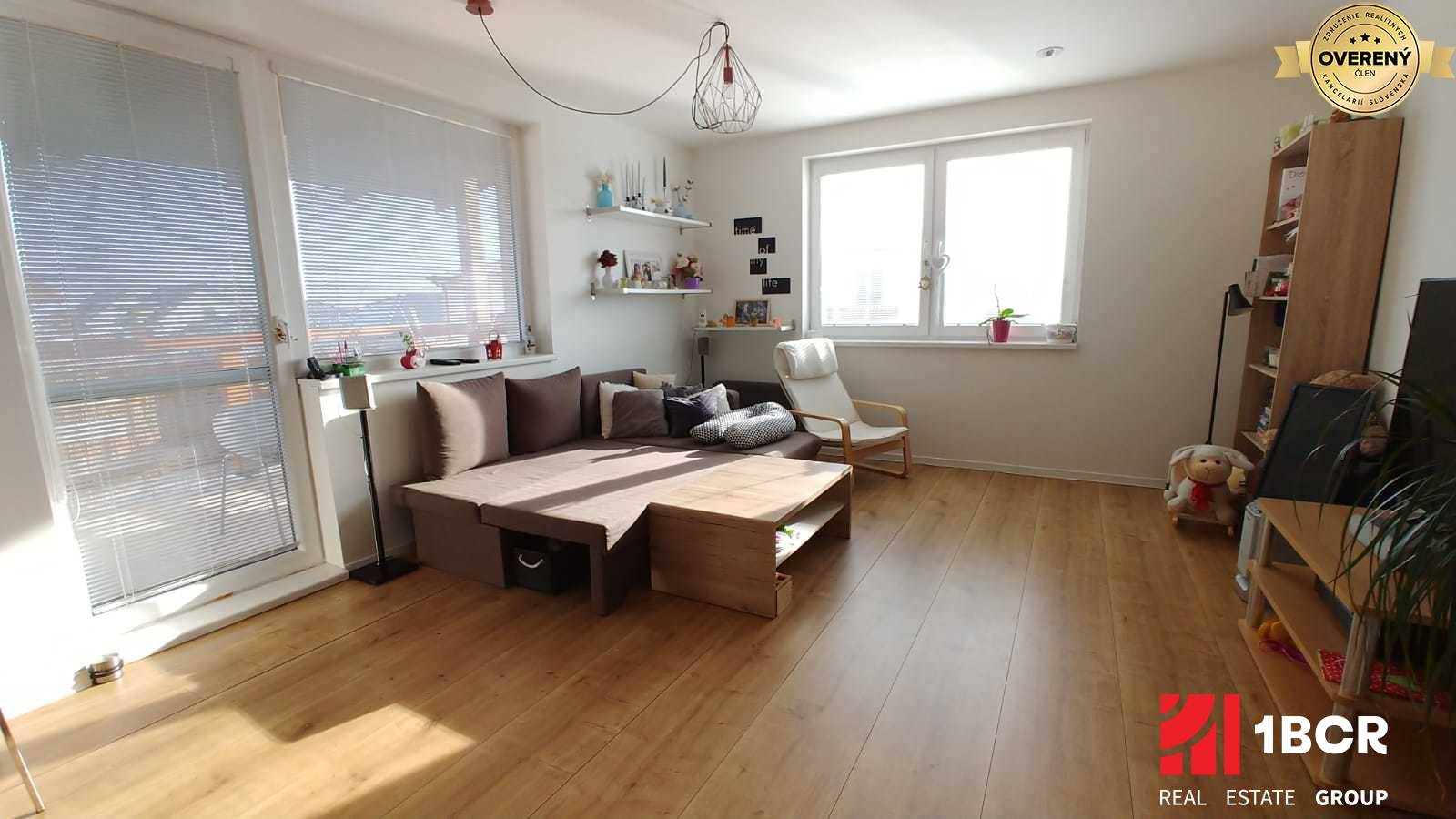 Samotný byt sa nachádza na 2.NP s rozlohou 90 m2. Pozostáva zo slnečnej obývacej izby prepojenej s kuchynským kútom, dvoch spální, kúpeľne s vaňou a WC, komory a samostatného WC. Súčasťou bytu je priestranná loggia (7,4 m2) a vlastná záhradka priamo pod bytovým domom. Byt disponuje vlastným plynovým kotlom, v celom byte je podlahové kúrenie a prenajíma sa čiastočne zariadený. Je vhodný pre rodinku s deťmi, nefajčiarov a bez domácich zvierat.