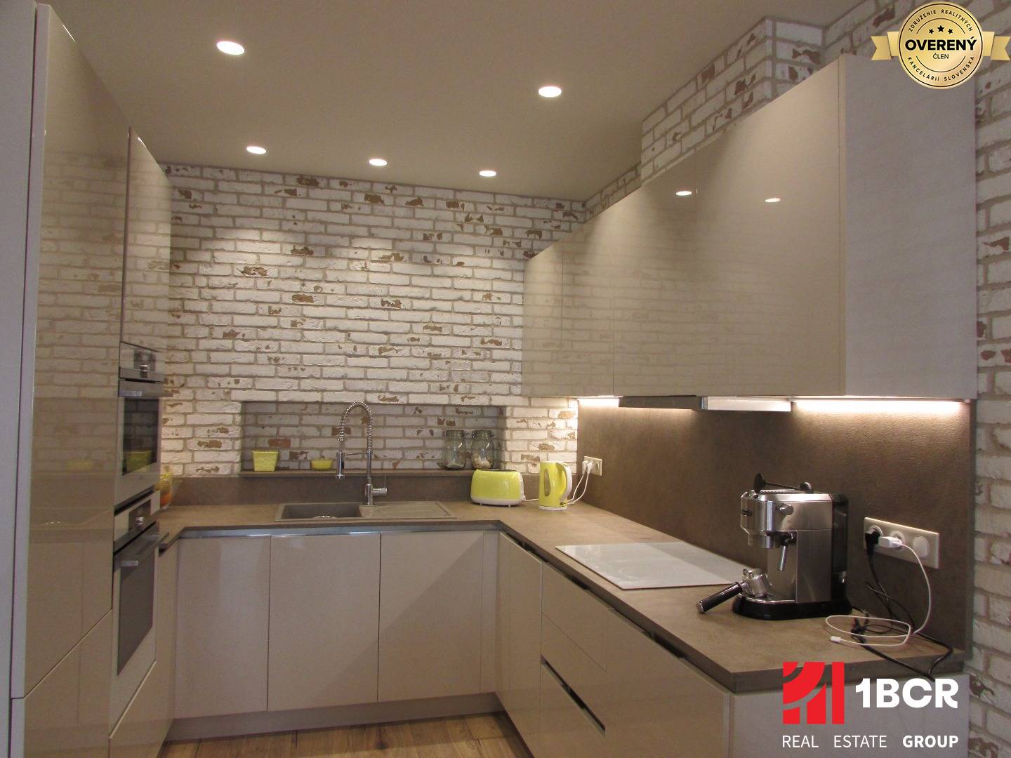 Vybavenie kuchyne - kuchynská linka v tvare "U" so zabudovanými spotrebičmi - indukčná varná doska, parná a teplovzdušná rúra, chladnička, umývačka riadu, kávomat, toastovač a varná kanvica. Kuchyňa je vybavená na plnú prevádzku.