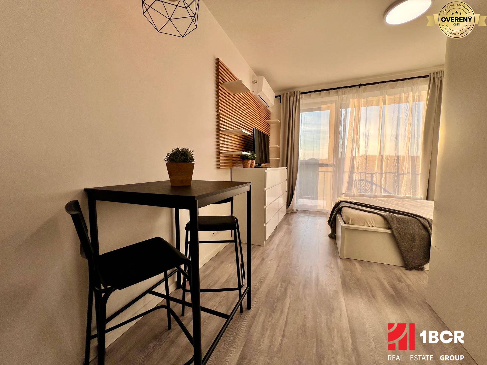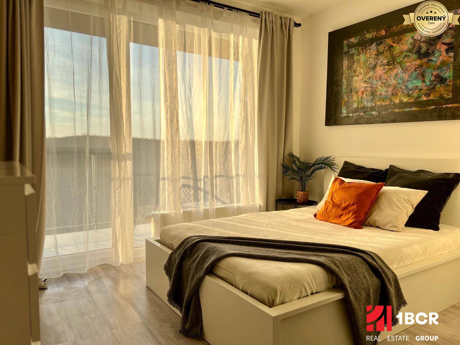 Samotný byt pozostáva zo vstupnej chodby vo vstavanou skriňou, ktorá sa postará o väčšinu úložného priestoru. Denná časť bytu je prakticky rozdelená na kuchynský kút s kuchynskou linkou a jedálenským posedením a tzv. spaciu časť, ktorá je vybavená manželskou posteľou, ďalšou veľkou skriňou a komodou. Príslušenstvom bytu je kúpeľňa so sprchovým kútom a toaletou a veľká slnečná loggia s výmerou až 8 m². Byt sa prenajíma kompletne zariadený tak, ako je vidieť na fotografiách vrátane smart TV, práčky či plne vybavenej kuchynskej linky vrátane príborov, pohárov či riadu. Vďaka plnohodnotnému vybaveniu Vám v byte nebude nič chýbať. Orientácia bytu je na západ, čo zaručuje krásne presvetlenie bytu. Horúčav sa v letných mesiacoch báť nemusíte, nakoľko je v byte inštalovaná klimatizácia.