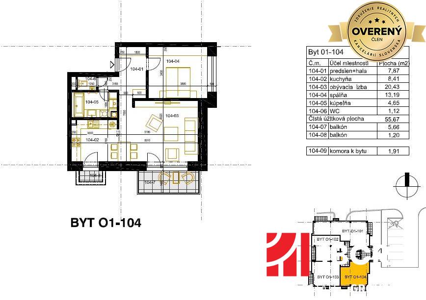 1.poschodie: 01-104: úžitková plocha bytu: 55,67 m² + plocha balkónov: 7,12 m² : CENA: 130 268 €