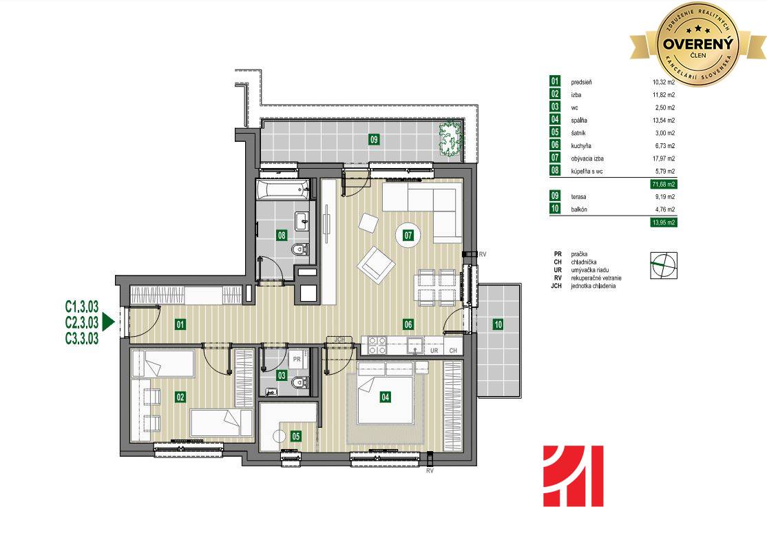 Výmera 3-izbových bytov je od 57,58 m2 - 71,85 m2 + príslušenstvo od 4,76 m2 - 51,90 m2